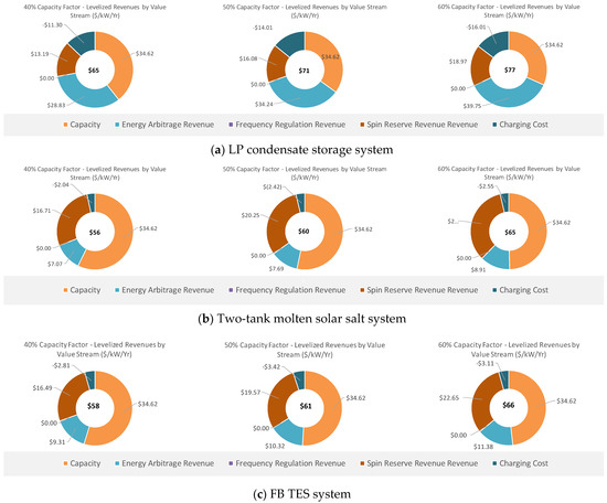 Levelized revenues by the value stream and other economic parameters were determined by the Competitive Markets Evaluation Tool for Storage (CoMETS, https://ces-ltd.in/competitive-market-evaluation-tools-for-storage-ces-comets/, accessed on 22 April 2023), a proprietary software suite developed by CES. CoMETS utilizes a mixed integer linear modeling (MILP) optimization engine to determine optimal hourly dispatch of an ESS to maximize potential market revenues subject to participation rules in various market segments under relevant operating constraints. Since the economic performance of the analyzed ESSs operating in different energy markets depends on the market rules, plant capacity factor (CF), and roundtrip efficiency of the ESS integrated with the plant, the CoMETs model is unique to each ISO system.