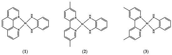 In this context, to further elucidate the role of the N-donor atom and to investigate the impact of substituent positioning within the diamine ligand, we synthesized and characterized three new complexes, denoted as [Ni(phen)(diam)] (1), [Ni(m-dmbpy)(diam)] (2), and [Ni(p-dmbpy)(diam)] (3), where phen = 1,10-phenanthroline, m-dmbpy = 3,3′- dimethyl- 2,2′-bipyridine, p-dmbpy = 4,4′- dimethyl- 2,2′-bipyridine, and diam = 1,2-phenylenediamine (Figure 1). The diimine ligands phen, o-dmbpy, and m-dmbpy were chosen for their distinct electron-donating properties. Phen exhibits stronger electron-donating capabilities than bipyridine due to its greater π-conjugation, facilitating more effective electron donation and delocalization compared to the less extensive conjugation in bipyridine. Consequently, phenanthroline acts as a more potent electron donor when coordinating with metal centers and also functions as a better π electron acceptor. Conversely, p-methyl substitution of diimine rings results in a moderate electron-donating character due to some conjugation between the rings and the Hammets constants (σp = −0.17 vs. σm = −0.07), thereby enhancing the overall donating character of the net bipyridine. In contrast, m-methyl substitution of the diimine ring leads to less conjugation since only inductive effects are present, rendering this ligand the weakest electron donor. All three complexes underwent evaluation for their photocatalytic and electrocatalytic activity in homogeneous solutions, taking into consideration the electron-donating properties of the diimine ligands. To further examine the durability of the photocatalytic system, CdTe-quantum dots were used as a photosensitizer.