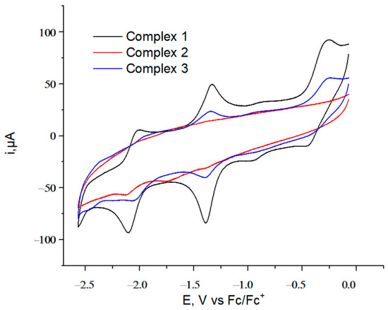 Cyclic voltammograms (CVs) were acquired under argon atmosphere at ambient temperature. The electrolyte solutions comprised tetrabutylammonium hexafluorophosphate (NBu4PF6) dissolved in N,N-dimethylformamide (DMF) serving as the supporting electrolyte. A three-electrode configuration was employed, with a glassy carbon electrode serving as the working electrode. The redox characteristics of the complexes were examined in the cathodic region, scanning from 0 to −2.75 V versus ferrocene (Fc+/0) (Figure 2). Complex 1 manifested four reductive waves at potentials of −0.45 V, −0.95 V, −1.38 V, and −2.12 V, demonstrating a semi-reversible nature (Table 2). Conversely, 2 and 3 displayed two and three reductive waves, respectively, albeit at diminished amperage levels compared to 1. Notably, complex 2 exhibited reduced solubility at higher concentrations (10−3 M). The reductive waves for 2 were observed at −1.74 V and −2,12 V with irreversible characteristics, whereas for 3, they were observed as reversible at −1.32 V, −1.74 V, and −2.12 V.