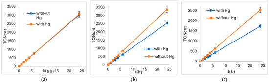 Figure 3. Photocatalytic hydrogen evolution of the solutions containing the complexes at C = 10–5 M/fluorescein (1 mM)/TEOA (0.5 M)/DMF:H2O (1:45) with and without Hg (a) 1, (b) 2, and (c) 3.