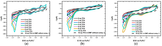 Figure 5. Electrocatalytic hydrogen production at a glassy carbon as a working electrode in a 10−3 M solution of complexes (a) 1, (b) 2, and (c) 3, in DMF (0.1 M n-Bu4NPF6) in the presence of increasing aliquots of TFA as a proton source. The black dotted CV corresponds to 100 mM TFA in the absence of catalyst. Reference electrode: Ag/AgCl, counter electrode: Pt wire, scan rate: 100 mV/s under Ar.