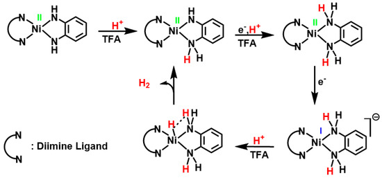 Taking into account all the aforementioned results, particularly the absence of a significant loss of reversibility in the cyclic voltammogram at approximately −1.00 V in the presence of acid, indicative of a rapid chemical reaction [50], we propose a PCET process. In this proposed mechanism, the reduction of the ligand occurs concomitantly with the protonation of the second nitrogen atom of the diamine, and this is followed by an Electron Coupling Electron Transfer (ECET) process, leading to the formation of the metal hydride and an intermediate species involved in the evolution of H2 [14,23,51,52]. Thus, a combined PCET/ECET mechanism is suggested for the H2 evolution (Figure 6) which aligns well with the molecular structure of the catalyst.