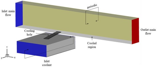 In the current work, the commercial solver ANSYS FLUENT™ (2020R2) is used to run an SBES numerical analysis of a cylindrical film cooling hole that operates at realistic operating conditions. The hole geometry is characterized by as the inclination angle, a diameter equal to D = 5 mm, and a length equal to L/D = 6. The numerical domain (Figure 1) reproduces the experimental test rig used by Christian Saumweber [19] in the experimental campaign held at the University of Karlsruhe. The coolant total pressure and the total temperature are imposed on the two symmetrical coolant inlets to guarantee inside the plenum. The main flow domain is instead characterized by an overall length of 47D, 16 of which represent the entry length from the inlet of the hot gas to the hole exit section. This entry length ensures the complete development of the wall boundary layer. Periodic conditions are applied on the main flow lateral faces to consider the effect of surrounding holes with a lateral pitch of 4D. Finally, the height of the main flow region was chosen to be equal to 8D to avoid any influence of the top wall on the interaction between the coolant and the hot gas.