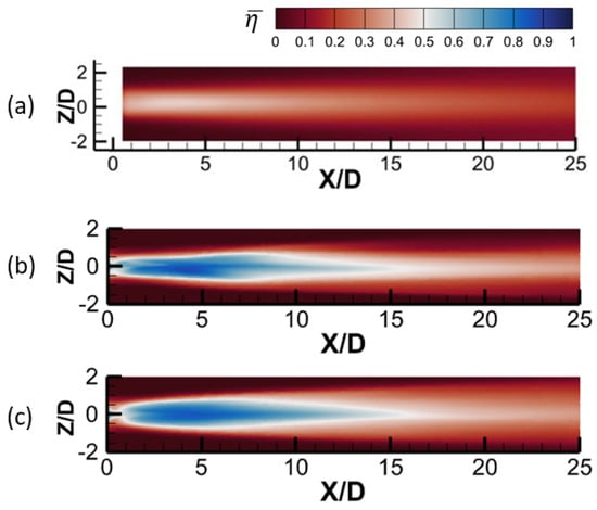 Time−averaged adiabatic effectiveness: (a) experimental, (b) SAS, and (c) SBES.