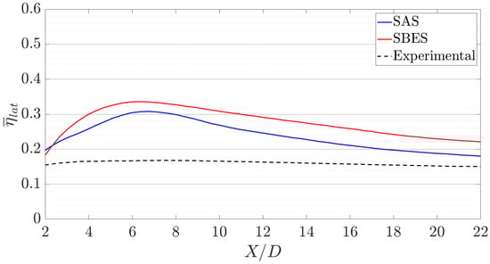 In this section, the numerical results are discussed and validated by comparing them with experimental measures. In Figure 3, the time-averaged adiabatic effectiveness obtained through the SAS and SBES models is compared with the available experimental data for the same conditions. The SBES model features a slightly better prediction than the SAS of the coolant lateral spreading, which roughly covers the full surface of the cooled plate at X/D > 15. Still, both SAS and SBES fail to reproduce the correct interaction between the main flow and the coolant, which results in a very cold region that extends up to X/D = 15 from the hole trailing edge. This behavior is quite evident looking at the laterally averaged values of the adiabatic wall effectiveness shown in Figure 4. Indeed, the adiabatic effectiveness is always over-estimated, with the highest discrepancy occurring over the highly covered region close to the jet. Although the two numerical approaches fail in reproducing the experimental trend of laterally averaged effectiveness, the hybrid RANS-LES model confirms the result of the SAS model, which allows for concluding that the misprediction is likely attributable to a difference either in the operating conditions or in the geometrical definition (i.e., a filleted hole) of the test case rather than to a lack of numerical accuracy. This problem was already underlined by Rosafio et al. [15] and was attributed to a mismatch of a momentum ratio and a density ratio with experiments, since this information is not specified in the experimental reports. Despite the cooling performance overestimation, the fast decay of laterally averaged effectiveness occurring at X/D > 10 and the increasing lateral coverage indicate a strong mixing interaction between the coolant and the hot gas, which is not captured by RANS or URANS approaches. The effectiveness maps reported by Rosafio et al. [14] are indeed characterized by a narrow strip at the centerline, without any lateral spreading of the cooling jet.