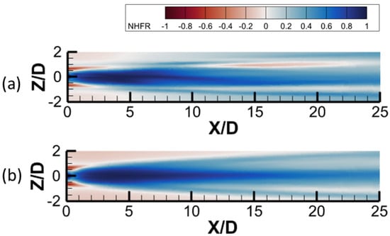 Time−averaged NHFR maps: (a) SAS and (b) SBES.