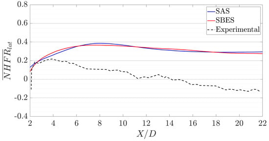 In Figure 5, time-averaged maps of the NHFR are plotted. The contour plots reveal a positive distribution of the NHFR above the cooled region, where the coolant film adheres to the wall. Small negative stripes are visible only at the lateral interface between the coolant and the hot gas, up to X/D = 3 for SAS (Figure 5a) and up to X/D = 2 for SBES (Figure 5b). In this region, the free stream is supposed to be altered by the impact with the cooling jet, thus producing a local increase in the surface heat transfer coefficient. Laterally averaged values are instead compared in Figure 6. In the experimental case, negative values of the NHFR are found for X/D > 14, which is conformal with an increase in heat transfer coefficient induced by the coolant interaction with the main flow.