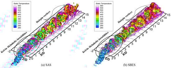 The higher is the modulus of used to generate the iso-surfaces, the smaller are the minimum length scales of the vortical structures that are visible after post-processing data from the simulations. The iso−surfaces shown in Figure 7 are generated by using a modulus of one order of magnitude lower than the one used in Figure 8. Results demonstrate that SAS and SBES models are able to predict the local interaction between the coolant and the hot gas that occurs at lower length scales. In fact, Figure 8 shows that the continuous coherent structures originating at the coolant hole exit are broken up into smaller eddies under the influence of the hot gas. Apart from the size of turbulent structures, both Figure 7 and Figure 8 demonstrate the ability to predict the unsteady coolant–main flow interaction further downstream of the coolant hole. That outcome can be speculated from the transport of the coherent structures along the hot gas path.