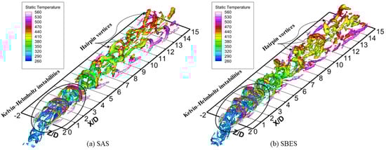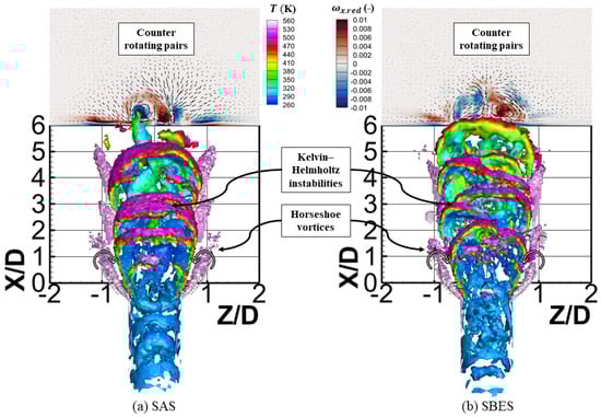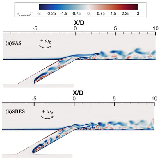 Notwithstanding the major similarities between the two numerical models, some differences can be noticed. It is clear how the SBES approach can capture the flow features with even more precision than SAS. This difference is clearly evident when observing the Kelvin–Helmholtz instabilities that rapidly develop in smaller structures in the mixing region in Figure 10b. The longitudinal distance between consecutive ridges is strongly reduced in the SBES case, and this emerges from the Z vorticity representation in Figure 11a obtained using SAS when compared with the SBES case in Figure 11b.