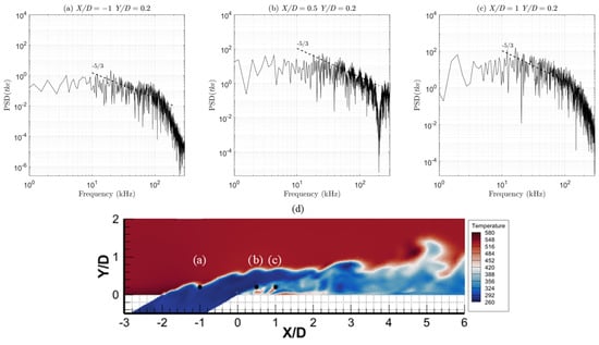 Further considerations about the turbulent energy captured by the SBES model can be deduced from the power spectral density (PSD) analysis. Figure 9a–c show the PSD of turbulent kinetic energy () at = 0.2, = −1, = 0.5, and = 1, respectively. In all cases, the energy decay aligns with the −5/3 slope of the energy cascade in the inertial sub-range, up to frequencies with a magnitude of [KHz]. The points selected for the analysis belong to the hole centerline ( = 0). Point (a) captures the shear layer between the coolant and the main flow, while points (b) and (c) investigate the coolant detachment from the wall (Figure 9d).