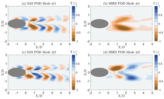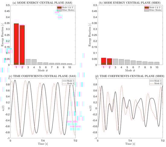 It is also interesting to notice that, for both SAS and SBES models, modes #1 and #2 appear almost equal in space but shifted in phase, and this is due to the traveling and alternating character of the vortical structures [27]. This behavior is confirmed by the time coefficient shown in Figure 13c,d, where it is evident that is only time-shifted with respect to and they present equivalent periodicity and amplitude.