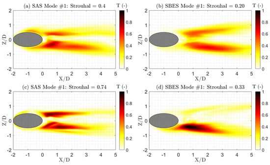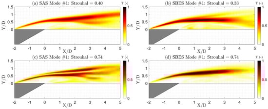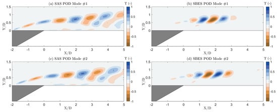 For the SAS simulation in Figure 14a,c, the energy content appears evenly distributed along the X direction, and the size of the wave packets progressively increases as the dimension of the structures increases. Meanwhile, in the SBES simulation (Figure 14b,d), most of the activity is concentrated at , where vortex structures are fully developed and incorporate hot gas bubbles within them. Looking only at the first two modes, the other areas appear completely devoid of energy, so in this case, it would be appropriate to also check the subsequent modes to obtain a faithful representation of the flow field. This is coherent with the POD spectrum, where the SBES energy fraction is evenly distributed among the modes, while for SAS, it shows a steep gap between the first two modes and the following ones.