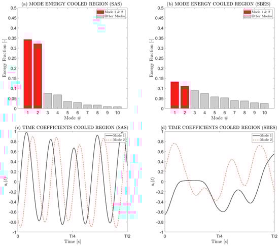 POD energy fraction per mode in the cooled region: (a) SAS, (b) SBES, (c) time coefficients of modes #1 and #2 (SAS), and (d) time coefficients of modes #1 and #2 (SBES).