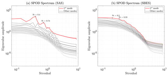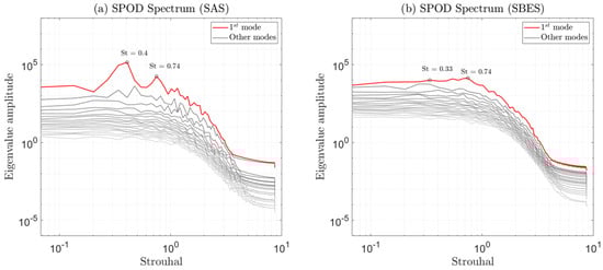 The SPOD spectrum of the cooled region in Figure 17a shows two leading spikes at St = 0.4 and St = 0.74 for SAS. Similarly, for the SBES spectrum in Figure 17b, a peak appears at St = 0.33, which is, however, preceded by a first one at St = 0.2. The main difference between the two energy spectra lies in the distance between the first mode and the other ones, since a huge separation can be noticed in the SAS model. This indicates that the phenomenon described by the first mode is predominant compared with the other modes, and in this case, the flow field shows low-rank behavior [31].