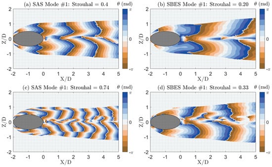 SPOD mode #1 phase in the cooled region: (a) SAS St = 0.4, (b) SBES St = 0.2, (c) SAS St = 0.74, and (d) SBES St = 0.33.