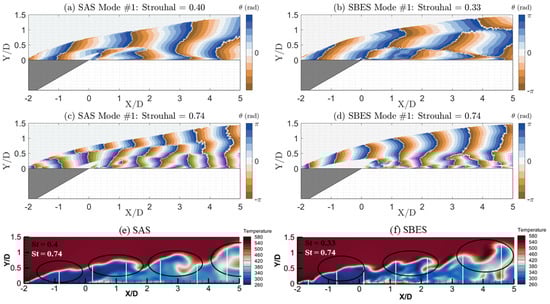 The energy spectrum for the central plane is plotted in Figure 20. The SBES analysis in this region shows good agreement with SAS, since the first relevant peak occurs at St = 0.4 (SAS) and St = 0.33 (SBES) and the second peak is found at St = 0.74 with both approaches. The mode shape at the corresponding frequencies, reported in Figure 21, shows that the main energy contribution spreads along the shear layer between the coolant and the hot gas, where the temperature field is affected by intense fluctuations. The mode magnitude plot of the SPOD analysis is coherent with the results shown in the POD section: the high-energy region is wider but less intense for the SAS model, while most of the energy content for the SBES case is concentrated in a narrow region at . This can be due to the greater distance between consecutive structures modeled by SAS, which allows a greater penetration of the main flow within the coolant jet (see Figure 11). The flow structures that emerge from the phase visualization in Figure 22a–d are equally placed in the two cases, with in-phase zones spaced by for = 0.4 (SAS) and = 0.33 (SBES) and by for In general, the spatial distance between coherent structures decrease with increasing numbers. The phase contour in the central plane is coupled with an instantaneous representation of the temperature field in Figure 22e,f. From this plot, it is possible to visualize that this region is dominated by Kelvin–Helmholtz instabilities, whose spacing coincides with the phase fronts at = 0.4 and = 0.33 in SAS and SBES, respectively.