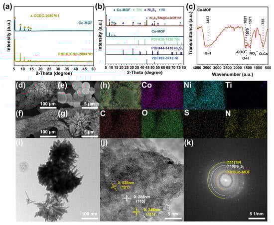 (a,b) XRD of Co-MOF and Ni3S2/TiN@Co-MOF/NF. (c) FTIR of Co-MOF/NF. (d,e) SEM of Co-MOF/NF. (f,g) SEM of Ni3S2/TiN@Co-MOF/NF. (h) EDS of Ni3S2/TiN@Co-MOF/NF. (i,j) TEM of Ni3S2/TiN@Co-MOF/NF. (k) HRTEM of Ni3S2/TiN@Co-MOF/NF.