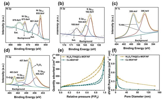 XPS of Ni3S2/TiN@Co-MOF/NF. (a) Ni (b) S (c) N (d) Ti. Co-MOF/NF, Ni3S2/TiN@Co-MOF/NF (e) Nitrogen adsorption–desorption (f) porosity.