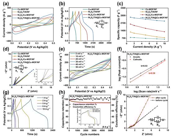 (a) CV for Co-MOF/NF, Ni3S2/TiN/NF, Ni3S2/Co-MOF/NF, and Ni3S2/TiN@Co-MOF/NF. (b) GCD for Co-MOF/NF, Ni3S2/TiN/NF, Ni3S2/Co-MOF/NF, and Ni3S2/TiN@Co-MOF/NF. (c) Specific capacitance retention in Co-MOF/NF, Ni3S2/TiN/NF, Ni3S2/Co-MOF/NF, and Ni3S2/TiN@Co-MOF/NF. (d) Nyquist curves for Ni3S2/TiN/NF, Ni3S2/Co-MOF/NF, and Ni3S2/TiN@Co-MOF/NF. (e) CV of Ni3S2/TiN@Co-MOF/NF with varying scan rates. (f) Relationship between Ni3S2/TiN@Co-MOF/NF’s peak current and scan rate. (g) GCD of Ni3S2/TiN@Co-MOF/NF with varying current densities. (h) Test of cyclic stability over 5000 turns, featuring power density of 8 A g−1. (i) Energyquist curve prior to and subsequent to cyclic stability test of 5000 turns.