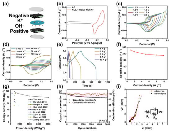 Figure 4b illustrates the cyclic voltammograms of both Ni3S2/TiN@Co-MOF/NF and activated carbon, configured within a trio of electrodes system, and captured using a scanning velocity of 10 mV s−1. This suggests that the voltage span extends between 0 V and 0.5 V for Ni3S2/TiN@Co-MOF/NF and from −1 V to 0 V for AC. Figure 4c illustrates that, over the interval where the voltage fluctuated within a range of 0 V to 1.6 V, the rate at which scanning was conducted was 50 mV s−1; there was no apparent polarization phenomenon, and when it was 1.7 V–2.0 V, the polarization phenomenon was gradually evident, and so to avoid the occurrence of the polarization phenomenon, the ideal voltage range of 1.6 V was chosen as the value.