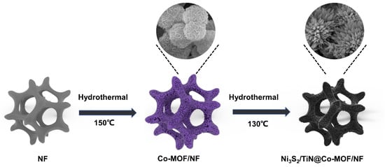 The two-step hydrothermal technique used in this plan to manufacture the Ni3S2/TiN@Co-MOF/NF materials is depicted in Scheme 1. According to the relevant literature reports, the equations involved in the processes related to the preparation of the samples are shown below [,,,]: