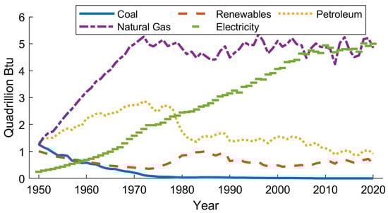 The United States residential sector uses more energy than the commercial sector. Historical data on energy consumption in the United States by end sector, based on the most recent data in [,], are presented in Figure 1.