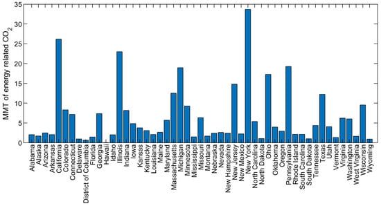 Guo et al. emphasized how crucial it is to comprehend household power usage trends to guide local decarbonization initiatives []. Data on state energy-related carbon dioxide (CO2) emissions by sector in 2021 shed light on the carbon footprint associated with residential energy consumption in different states []. A closer analysis reveals significant variations in CO2 emissions between states, reflecting differences in energy sources, consumption patterns, and efficiency measures. States with high residential CO2 emissions, such as California, Illinois, New York, and Pennsylvania, often coincide with densely populated areas and extensive urbanization, where the energy demand is inherently high. On the contrary, states with lower emissions, such as Hawaii, Vermont, and the District of Columbia, tend to have smaller populations and may rely more on renewable energy sources or have implemented energy efficiency initiatives. For instance, Hawaii has abundant solar resources. It has made substantial investments in solar energy production, leading to lower reliance on fossil fuels and subsequently lower CO2 emissions from residential energy use. These variations underscore the importance of regional considerations in addressing carbon emissions from residential energy use. State energy-related carbon dioxide emissions by residential use are shown in Figure 5 []. Based on this data, New York tops in energy-related CO2 emission. New York is actively pursuing significant CO2 emission reductions through several initiatives under the Climate Leadership and Community Protection Act (CLCPA). This law mandates a reduction of statewide greenhouse gas emissions to 60% of 1990 levels by 2030 and to 15% of 1990 levels by 2050, aiming for economy-wide carbon neutrality by mid-century. California, on the other hand, is actively working to reduce CO2 emissions through various comprehensive measures. The state aims to achieve carbon neutrality by 2045, with significant investments in renewable energy and nature-based solutions.