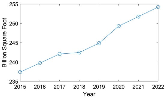 As shown in Table 1, between 2015 and 2022, there was a general trend of fluctuation in energy consumption, measured in trillion Btu [], across billions of square feet of space [], with a corresponding change in energy intensity, measured in kWh per square foot. Despite variations, there was an overall increase in energy consumption from 2015 to 2022, with peaks in 2018 and 2022, while energy intensity showed a slight fluctuating trend but remained relatively stable.