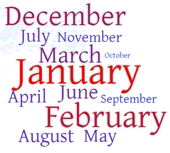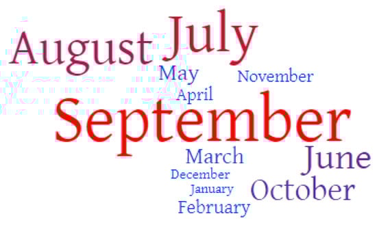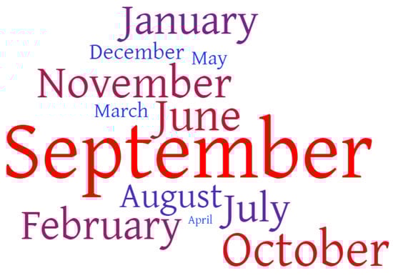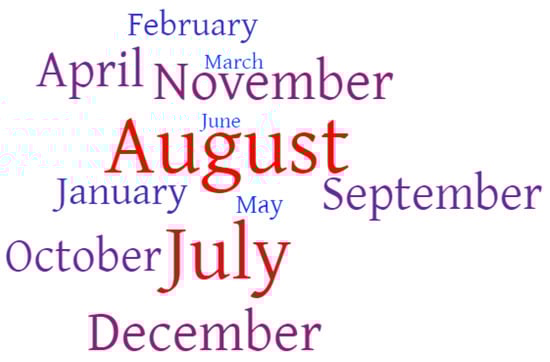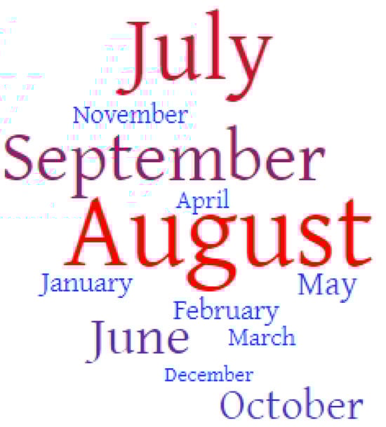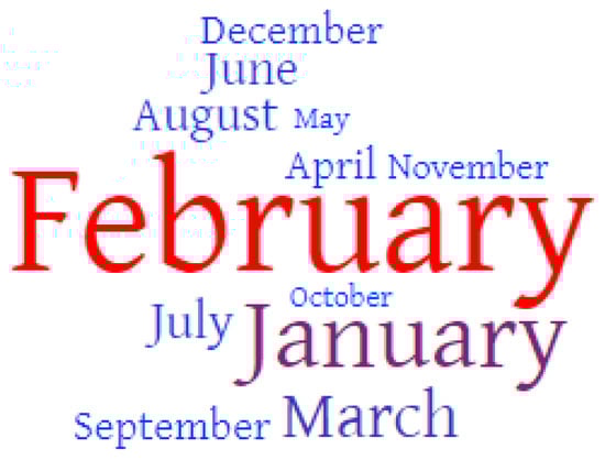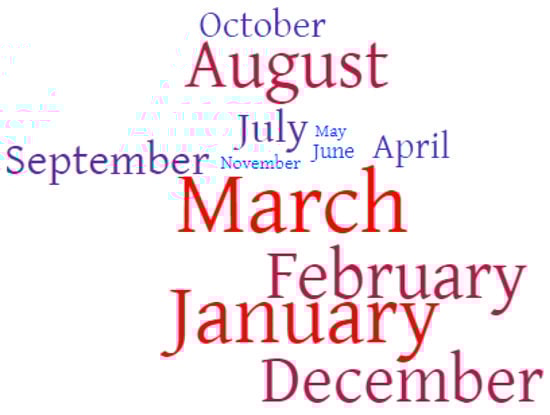 The months with the most energy consumption are depicted in Figure 13. While January and March are highlighted with larger words, it is important to note that February maintained an average daily consumption of kWh, consistent with the other two months, as previously mentioned. It is worth highlighting that February had 28 days in 2022. The total kWh consumed each month varied throughout the year, ranging from a low of 672 kWh in May to a high of 1094 kWh in March. The highest consumption occurred during the winter months, which is expected due to the increased use of heating systems.