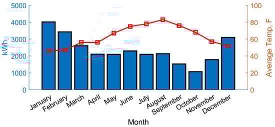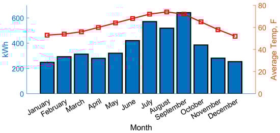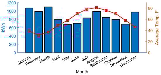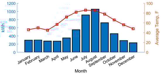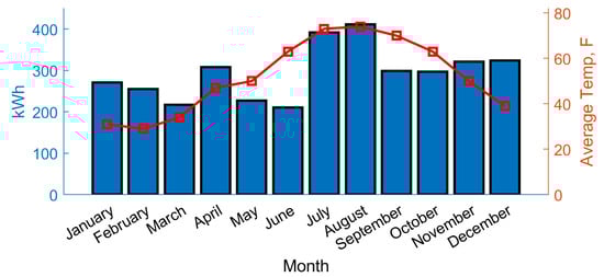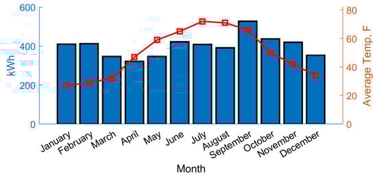 The annual electricity consumption of the apartment was based on the utility bills for 12 months and amounted to 10,432 kWh. The yearly energy intensity value obtained for this building was 9.57 kWh/ft2. Monthly electricity use and average temperature for case 4 are depicted in Figure 14.