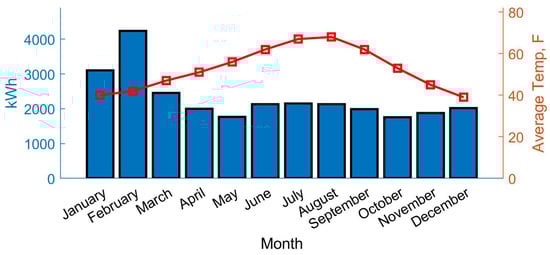 In this case study, data from a 2072 ft2 apartment built in 1995 are presented from Atlanta, Georgia, zip code 30005. The apartment is front-brick type, second floor, and vinyl-sided with standard R-18 for walls. The house uses electricity for heating and water heating. As shown in Table 4, the monthly energy consumption of this house ranges from 1074 kWh in October to 4010 kWh in January. The most energy consumption happens during the months of January, February, and December, as depicted in Figure 9.