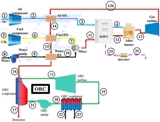 The schematic diagrams of the combined SOFC-GT-ORC.