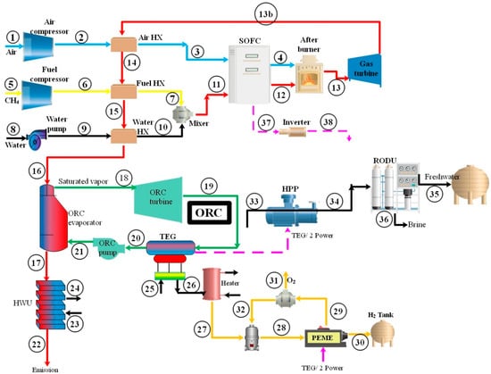 Schematic drawings of the recommended configurations are displayed in Figure 1 and Figure 2. A SOFC-GT powered by natural gas (NG) functions as a topping system in two different configurations. Under Configurations 1 and 2, the primary bottoming system was toluene ORC. Then, in Configuration 2, a TEG was used to generate extra power in the energy rejection stage of the ORC, and an HWU was used to recuperate the residual energy of exhaust gas to 70 °C (minimum temperature of exhausted gas) in hot water. While the output power of TEG was provided to PEME and RODU for the production of hydrogen and drinkable water, the output power of topping SOFC + GT was used to generate electricity through a generator. In order to obtain the desired operational pressure for the SOFC, the air (at Point 1) and methane (CH4) as a fuel source (at Point 5) within the subsystem of the SOFC were passed via compressors (an air compressor and a fuel compressor, respectively) under normal atmospheric circumstances. Similarly, a water pump was used at Point 8 to achieve the required water pressure. Three heat exchangers (HXs) were then used to raise the temperature of these flows to the SOFC’s intake temperature. These HXs removed heat from the exhaust gas that the heater of Turbine 1 produced. Subsequently, the fuel and water vapor were combined and introduced to the anode of the SOFC (at Point 11), where the internal reforming reaction took place. The air entered at Point 3 on the cathode side. Direct current (DC) electricity was produced in the SOFC by the electrochemical reaction of the air with the mixture mentioned before. The DC electricity generated at Point 24 was converted into AC power at Point 25 using an inverter. The remaining methane from the SOFC’s anode at Point 12 was sent into an afterburner (AB) in the exhaust stream. Following their exothermic reaction at Point 4, the fuel and air leaving the SOFC cathode enhanced the temperature of the outgoing stream at Point 13. After entering Turbine 1 to generate electricity, this high-temperature stream acted as a heat source for HXs in the exhaust stream that results. The heat source for bottoming subsystems was the water-based heat exchanger at Point 16, which kept the temperature of its exit gas elevated.
