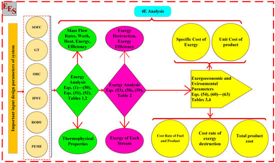 Using the relevant correlations in the Engineering Equation Solver (EES), the analysis of energy, exergy, exergy-economic, and environmental simulations (4E) pertaining to the previously described configurations has been carried out. A number of simplifying assumptions have been made for the simulation’s benefit, as listed below [36,39,40,41,42]: