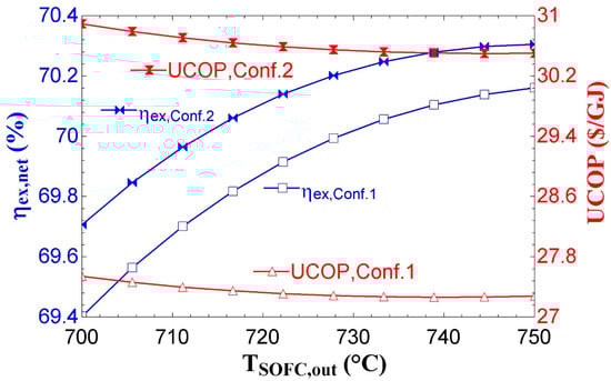 The effect of change in TSOFC,out on the exergy efficiency and UCOP of the two configurations.