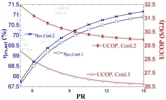The effect of change in the PR on the exergy efficiency and UCOP of the two configurations.