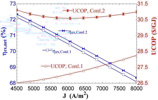 The effect of change in the current density of the SOFC on the exergy efficiency and UCOP of the two configurations.