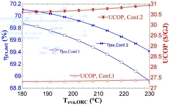 The effect of change in evaporation temperature of the ORC on the exergy efficiency and UCOP of the two configurations.