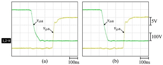 ZVS turn-on waveforms of S8 at (a) 100% load; (b) 10% load.