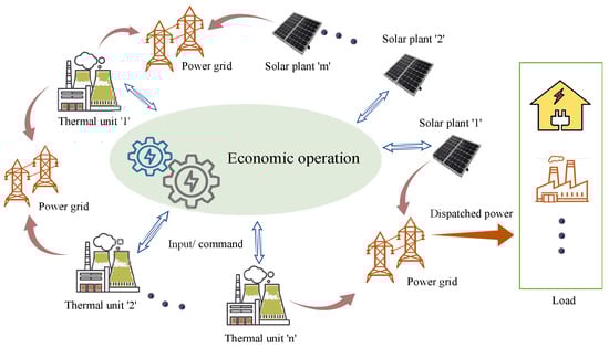This study considers a hybrid power system (HPS) consisting of ‘n’ thermal units and ‘m’ solar plants supplying power to the connected loads, as shown in Figure 1. Let be the power generated by the i-th thermal generating unit. The fuel cost is given by