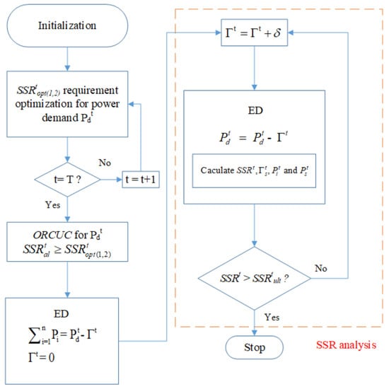 - For a set of committed thermal units, problem (34) is solved to maximize the solar share within the range of a robust SSR. To solve this problem, the SSR ranges must be defined, and as well as the solar share limit must be evaluated for each range. Thus, to answer the questions posed in the Introduction section, the data sets , , and are generated to define the SSR ranges for the answers (ii), (iii), and (iv), respectively. The solar share is initialized with a value equal to zero and increased iteratively with step size . For each iteration, ED is carried out to evaluate , , and . The resulting evaluations of are allocated to either of the previously defined ranges based on the following criteriaThe process is repeated until convergence. For any total number of iterations, say Y, the data sets are given bywhere D, S, and C are the maximum number of iterations for each range, respectively. The maximum limits of the robust SSR range and solar share are found when is dedicated to thermal contingencies only, i.e., the outcomes of answer (ii) are as follows:where is the index of the maximum value in , i.e.,Furthermore, the SSR for solar outage, i.e., , can be evaluated simply by subtracting the from . Similarly, the evaluations corresponding to answers (iii) and (iv) are given bywhere and are the indices of the maximum values in and , respectively, i.e.,In this way, the problem is solved to evaluate the robust SSR, and the procedure is called SSR analysis. The procedural flow of the solution of problem (34) is shown in Figure 2, in which the highlighted portion shows the SSR analysis. For further clarifications, a graphical illustration of the SSR analysis will be discussed in detail in Section 4.