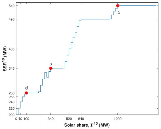 where is the SSR at point ‘d’ and calculated by executing ED repeatedly for every step increment of the solar share. For further illustration, Table 4 presents the values of and as functions of .