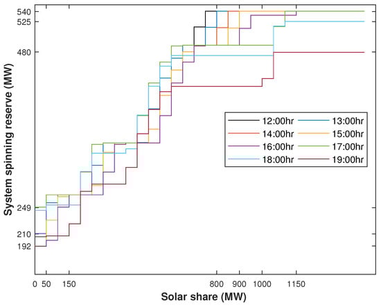 For instance, if 520 MW of solar share is intended to be added in the system, the corresponding SSR comes out to be 405 MW, as can be seen in Figure 4. Thus, the power deficit for this solar outage will be 115 MW. To cope with the power deficit in case of the simultaneous outages of solar and thermal powers, a dedicated allocation to thermal, as well as solar contingencies, is proposed. The dedicated allocated to the thermal contingency events is and that for solar power outage is given as follows: