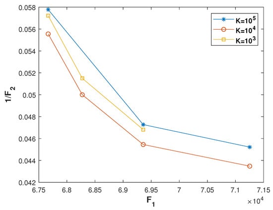 where and are the weights assigned to the solar cost and number of committed solar plants, respectively. K is the parameter used to determine the significance of the maximization of the number of solar plants compared to the solar cost minimization. For the readers’ convenience, and are defined to denote the solar cost and the number of solar plants, respectively, and we rewrite problem (56) as follows: