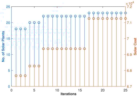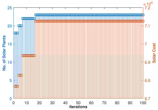 Figure 8 depicts the results for 100 iterations. In this figure, 100 iterations are implemented to ensue that and cover the entire range of possible values, i.e., 0 ≤ ≤ 1. In comparing Figure 7 and Figure 8, it can be observed that further solutions cannot be achieved after 25 iterations. The aforementioned discussions reveal that the solar share maximization and the solar cost minimization are contradictory objectives. Furthermore, as only a few Pareto-optimal solutions are possible, the choice of the final solution depends on the priorities established by the system operator. For instance, the system operator may choose an appropriate solution based on the priorities of the objectives. Different system operators may have different priorities based on the local energy market and the energy policies of the territory. For instance, some system operators may assign higher ranks to the cost of operation, while reliable system operation may be more significant for the others.