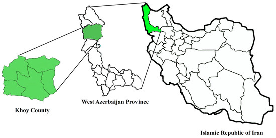 Khoy County, which covers an area of approximately 2000 km2, is located in the northwestern region of Iran, specifically in the northwest sector of the West Azerbaijan province (38°45′ N, 45°15′ E). It shares borders with Maku to the north, Marand to the east, Salmas to the south, and Turkey to the west (Figure 1). Furthermore, this county is organized into four districts, including five cities, 11 rural districts, and a total of 222 villages within its limits.
