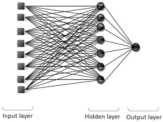 A multilayer perceptron neural network was used in the backpropagation algorithm. The network consisted of an input layer with eight neurons (representing input energies) and an output layer with one neuron (representing output energy). Additionally, one and two hidden layers were employed at five different levels of neuron count (2, 4, 6, 8, and 10). Figure 3 illustrates the structure of the multilayer perceptron. In this study, the Levenberg–Marquardt algorithm was used for weight adjustment in the ANN. This algorithm was chosen for its quick network training and minimizing of the error level, making it one of the most widely used algorithms in this field.