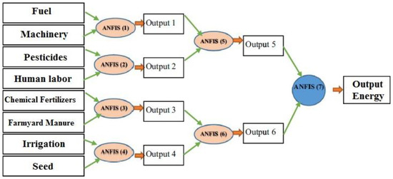 To address this constraint, innovative techniques such as data clustering can be employed [33]. In this study, the input variables, as shown in Figure 4, were combined pairwise, and each pair entered a standard ANFIS. In the second stage, ANFIS 5 combined the predicted values of ANFIS 1 and 2, and ANFIS 6 combined the predicted values of ANFIS 3 and 4. Finally, the predicted values of ANFIS 5 and 6 were combined as input for ANFIS 7, and the output of ANFIS 7 represented the predicted energy value of the oil seed sunflower production. All ANFIS structures were evaluated and examined with triangular (trimf), bell-shaped (gbellmf), and Gaussian (gaussmf) membership functions using MATLAB 2017 software with two and three inputs.