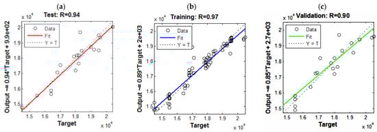 Correlation between the predicted and actual output energy values in test (a) training (b) and validation (c) data.
