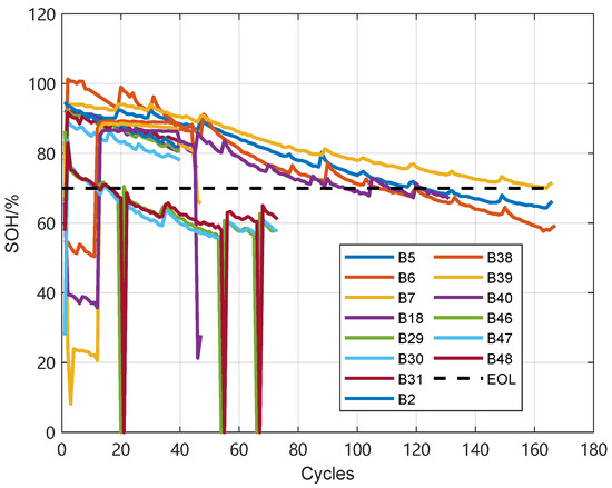 We utilized the dataset from [26]. Figure 1 provides an overview of the dataset. The dataset comprised 28 individual cells that were classified into seven distinct test groups (Group 1: cells #5–#7, #18; Group 2: cells #25–#28; Group 3: cells #29–#32; Group 4: cells #33, #34, #36; Group 5: cells #38–#40; Group 6: cells #41–#44; Group 7: cells #45–#48; Group 8: cells #49–#52; and Group 9: cells #53–#56.), according to specific protocols and procedures. Table 1 provides a detailed overview of the conditions under which these batteries were tested.